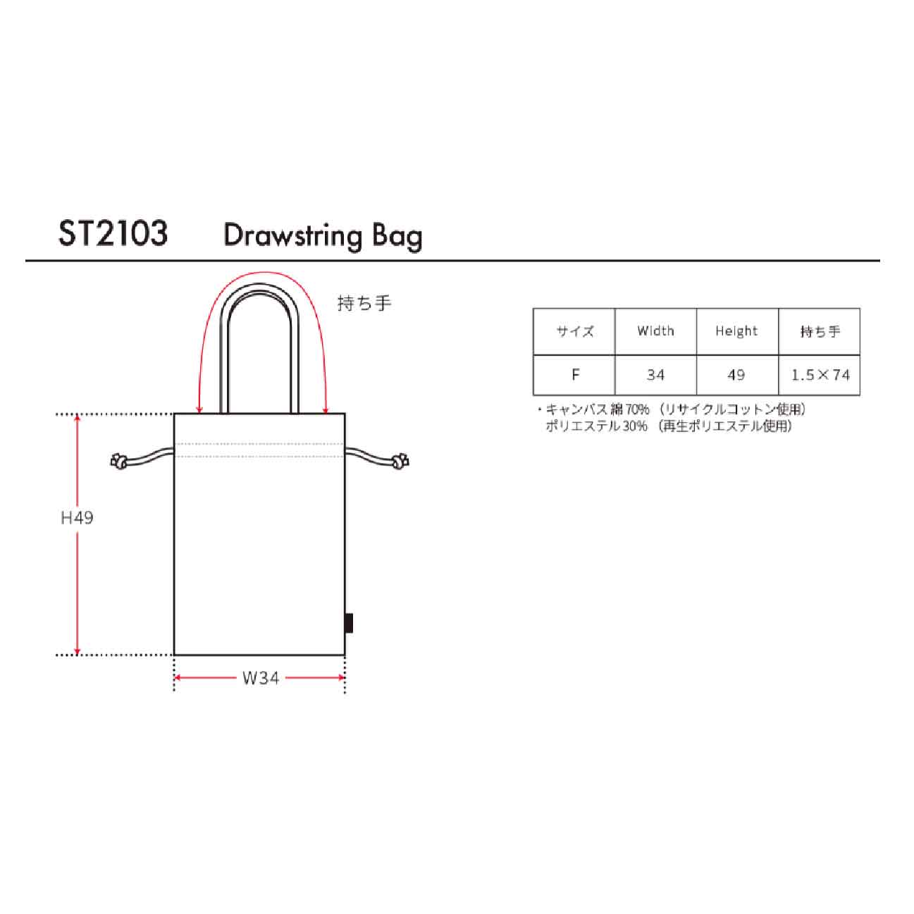 本体:W34×H49, 持ち手:1.5×74cm