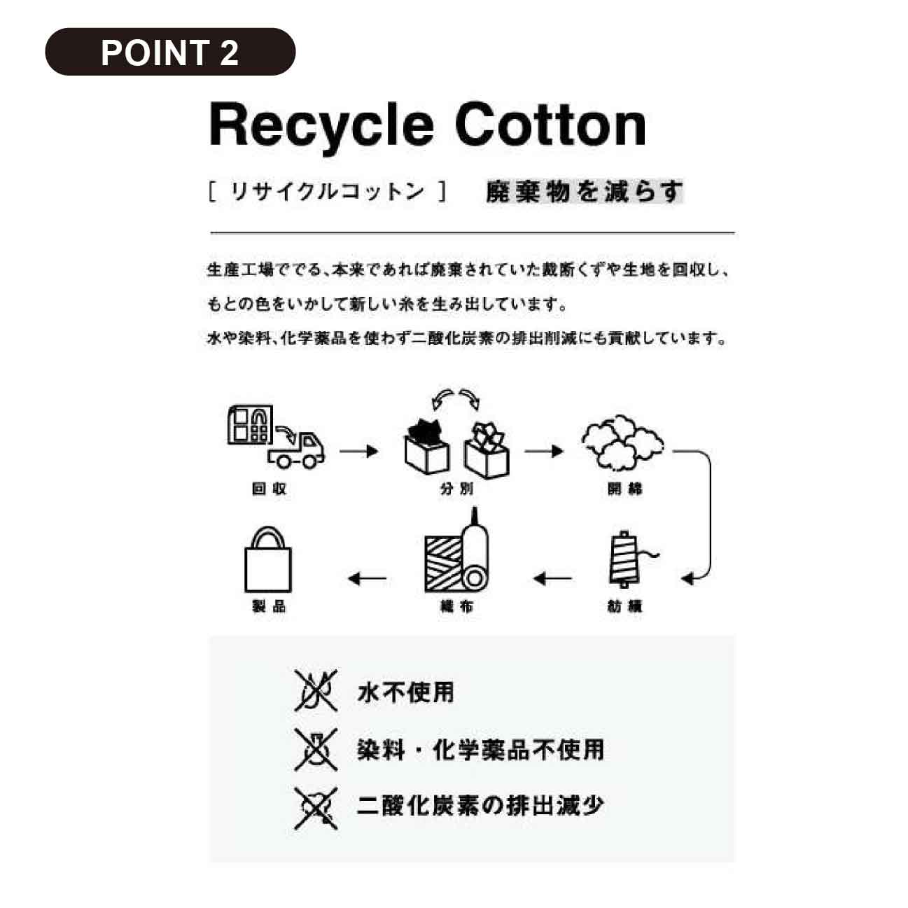 廃棄予定の裁断くずや生地を回収し、水や染料、化学薬品を使用せず新しい糸を生み出しているので、二酸化炭素の排出削減にも貢献しています。